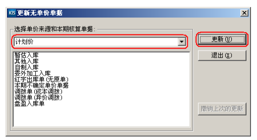 4. 無單價單據(jù)維護:對于無單價入庫單,系統(tǒng)提供了一個簡易快速方法批量維護其單價,單擊【存貨核算】→【無單價單據(jù)維護】→【更新無單價單據(jù)】,在這里我們可以選擇以計劃價、最新入庫價、最新出庫價、期初加權(quán)平均價等價格對無單價單據(jù)進行更新,具體采用哪一種價格標準,請根據(jù)所在公 司財務(wù)核算要求確定。