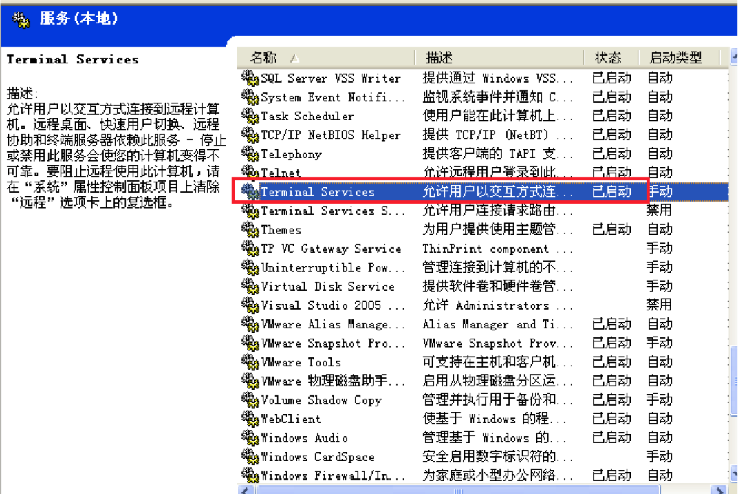 瑞友天翼5872的服務(wù)問題是因?yàn)椴僮飨到y(tǒng)中終端服務(wù)terminal services禁用了,把這個(gè)服務(wù)啟用就可以解決這個(gè)問題了。