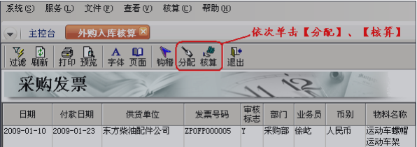 2 外購(gòu)入庫(kù)核算:有采購(gòu)發(fā)票的外購(gòu)入庫(kù)單在這里進(jìn)行入庫(kù)核算,其核算邏輯是通過(guò)采購(gòu)發(fā)票確定外購(gòu)入庫(kù)成本; 操作如下:打開(kāi)【存貨核算】→【入庫(kù)核算】→【外購(gòu)入庫(kù)核算】,依次單擊【分配】、【核算】即可。