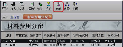 8 費(fèi)用分配:依次進(jìn)行【材料費(fèi)用分配】、【其它費(fèi)用分配】、【制造費(fèi)用分配】,直接單擊【自動(dòng)】,系統(tǒng)即按設(shè)定的分配標(biāo)準(zhǔn)進(jìn)行費(fèi)用分配。