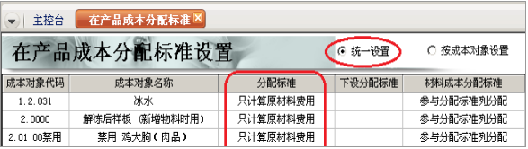 9.1.2 有投產(chǎn)的成本對(duì)象是否定義了在產(chǎn)品分配標(biāo)準(zhǔn):進(jìn)入【實(shí)際成本】→【分配標(biāo)準(zhǔn)設(shè)置】→【在產(chǎn)品成本分配標(biāo)準(zhǔn)設(shè)置】,選擇【統(tǒng)一設(shè)置】,在【分配標(biāo)準(zhǔn)】列首行選擇‘只計(jì)算原材料費(fèi)用’即可。
