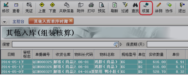 11.2 其它入庫(kù)(組裝核算):對(duì)組裝拆卸業(yè)務(wù)產(chǎn)生的其它入庫(kù)單進(jìn)行核算。操作如下:?jiǎn)螕簟敬尕浐怂恪俊救霂?kù)核算】→【其它入庫(kù)核算】,選擇‘其它入庫(kù)(組裝核算)’,選中所有其它入庫(kù)單后,單擊【核算】即可,核算成功,系統(tǒng)會(huì)自動(dòng)更新所有入庫(kù)單的單價(jià)與金額。